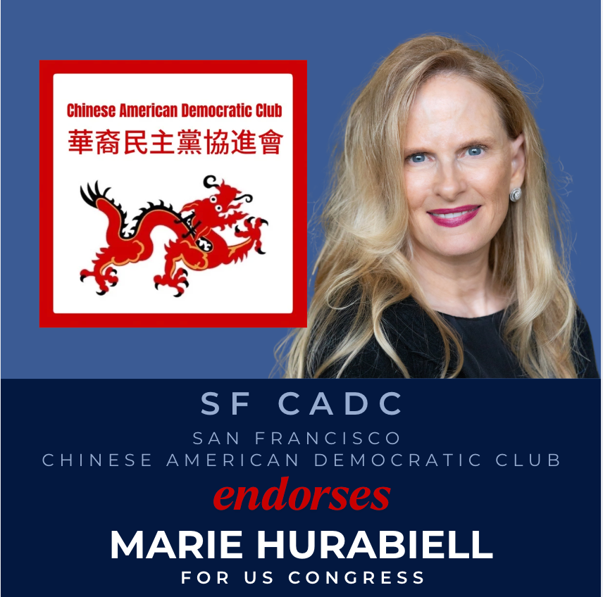 “Chinese American Democratic Club (CADC) has proudly endorsed Marie Hurabiell for Congress. Marie is a pragmatic leader who brings a common-sense approach to making government more accountable and efficient. She stood with CADC during critical moments, including the recall of District Attorney Chesa Boudin and opposing Prop K. Having interned in Nancy Pelosi’s congressional office and later serving as a federally appointed trustee, she understands how to navigate government and deliver results. As the organizer of the 30,000-member ConnectedSF and an early supporter of Daniel Lurie, she has championed clean streets and safer neighborhoods. Marie prioritizes affordability by tackling rising energy costs and government waste, while advancing AI security and exploring Universal Basic Income. We believe she will be an effective voice for our community.”